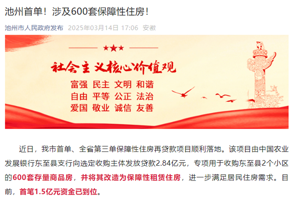 近日,池州市首单、全省第三单保障性住房项目银行融资顺利落地,该项目由中国农业发展银行东至县支行向选定收购主体发放贷款2.84亿元,专项用于收购东至县2个小区的600套存量商品房,并将其改造为保障性租赁住房,进一步满足居民住房需求。